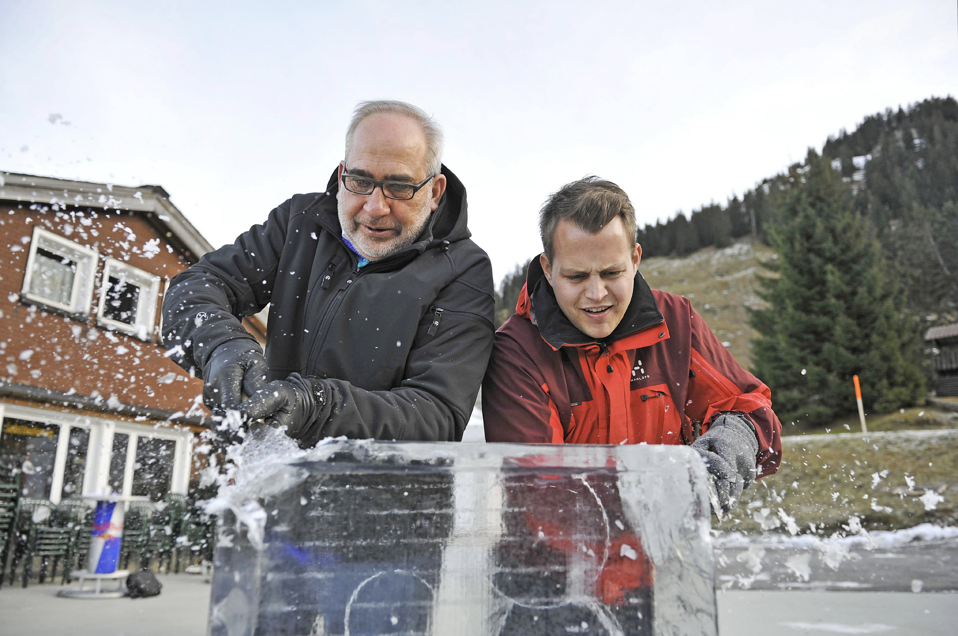 Eisblöcke, Schnitzwerkzeug, Handschuhe, Leitung durch Eiskünstler