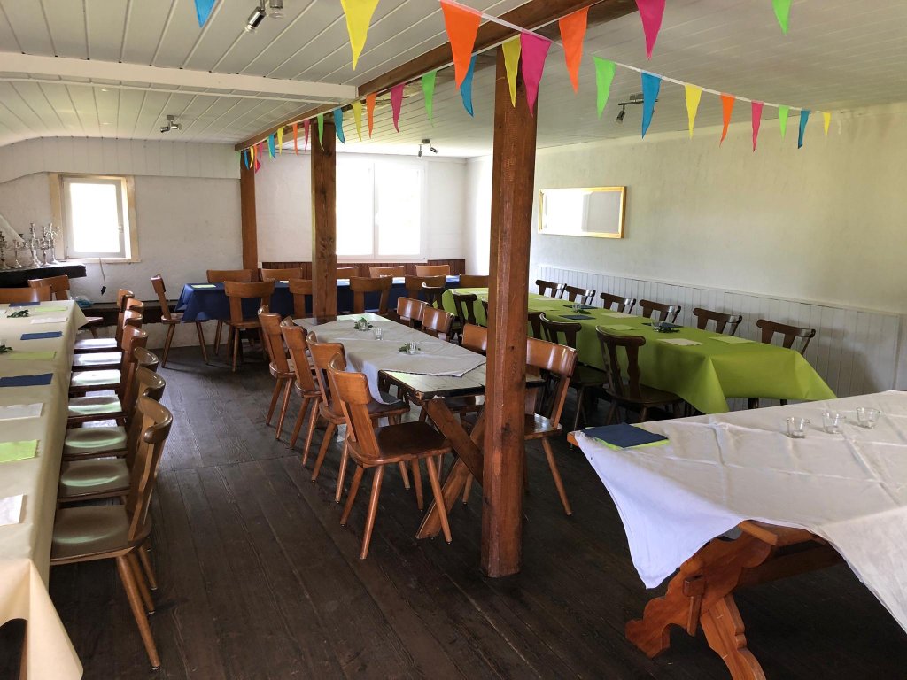Sie bietet Platz für ca. 60 Personen, sowie etwa 60 Personen draussen unter dem Vordach. Idyllisch, direkt am Waldrand gelegen, nur ca. 500 Meter oberhalb der Sihl, welche zu Fuss erreichbar ist.