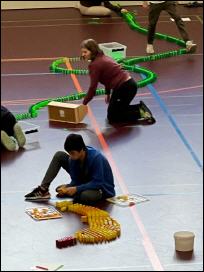 Der DominoDay kann überall in Seminarräumen, Turnhallen, je nach Wetter auch im Aussenbereich durchgeführt werden. Dazu benötigen wir lediglich 1 Tisch pro Team den Rest bringen wir für Sie.