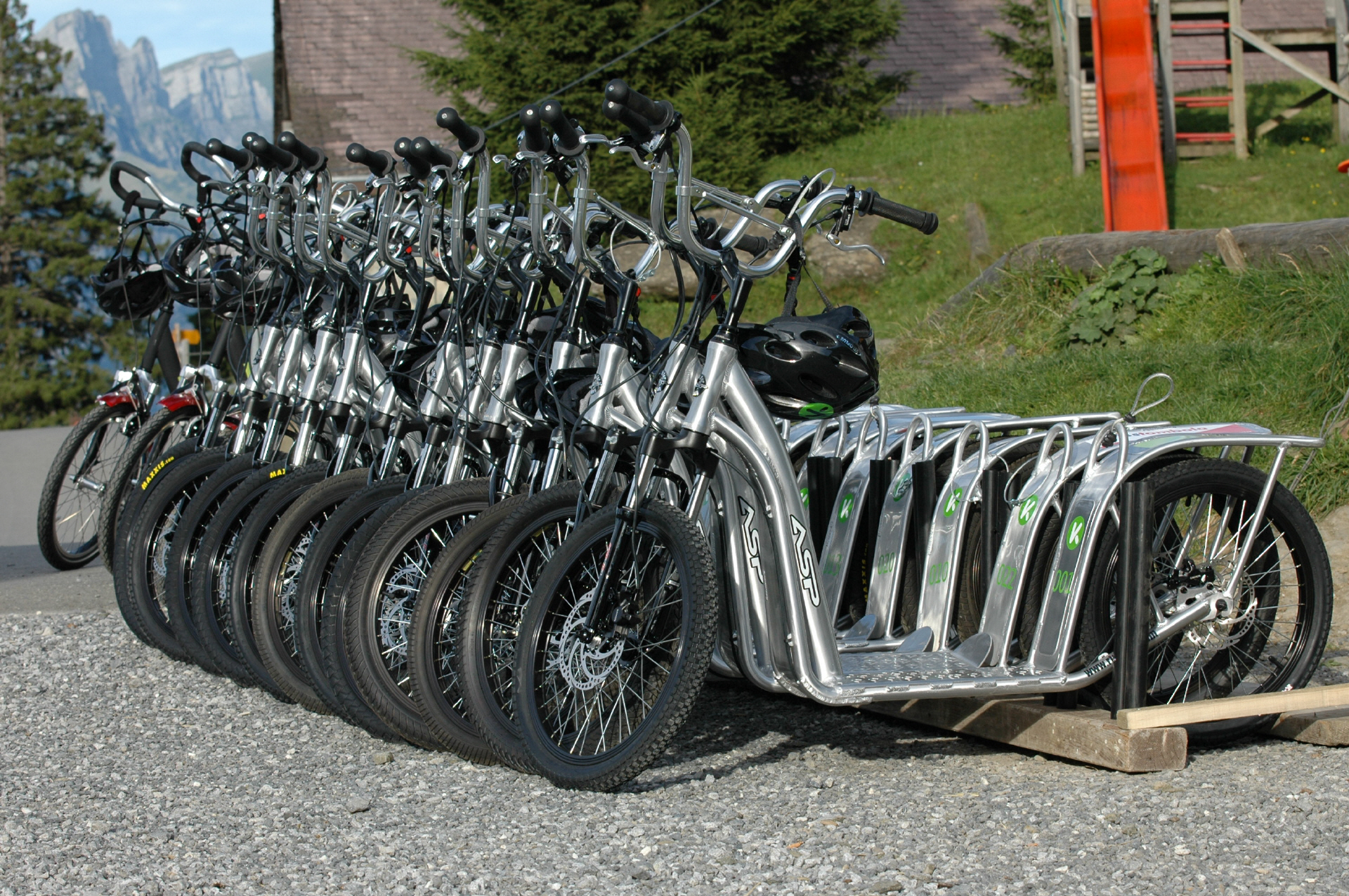 Dann wird’s rasant: Mit unseren Trottis (ja, Tretroller mit Stil!) saust Ihr die Strecke hinab zur Talstation. Keine Sorge, auch ohne Helmfrisur ist der Spaß garantiert! Unten angekommen, könnt Ihr die Trottis einfach in unserem Container abstellen.