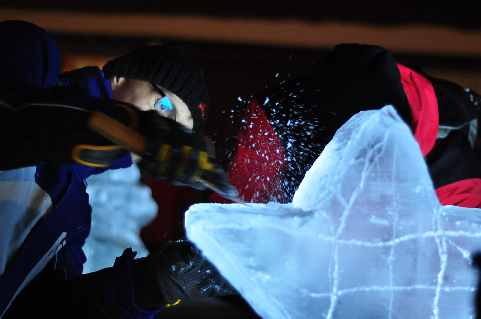 Eisblöcke, Schnitzwerkzeug, Handschuhe, Leitung durch Eiskünstler