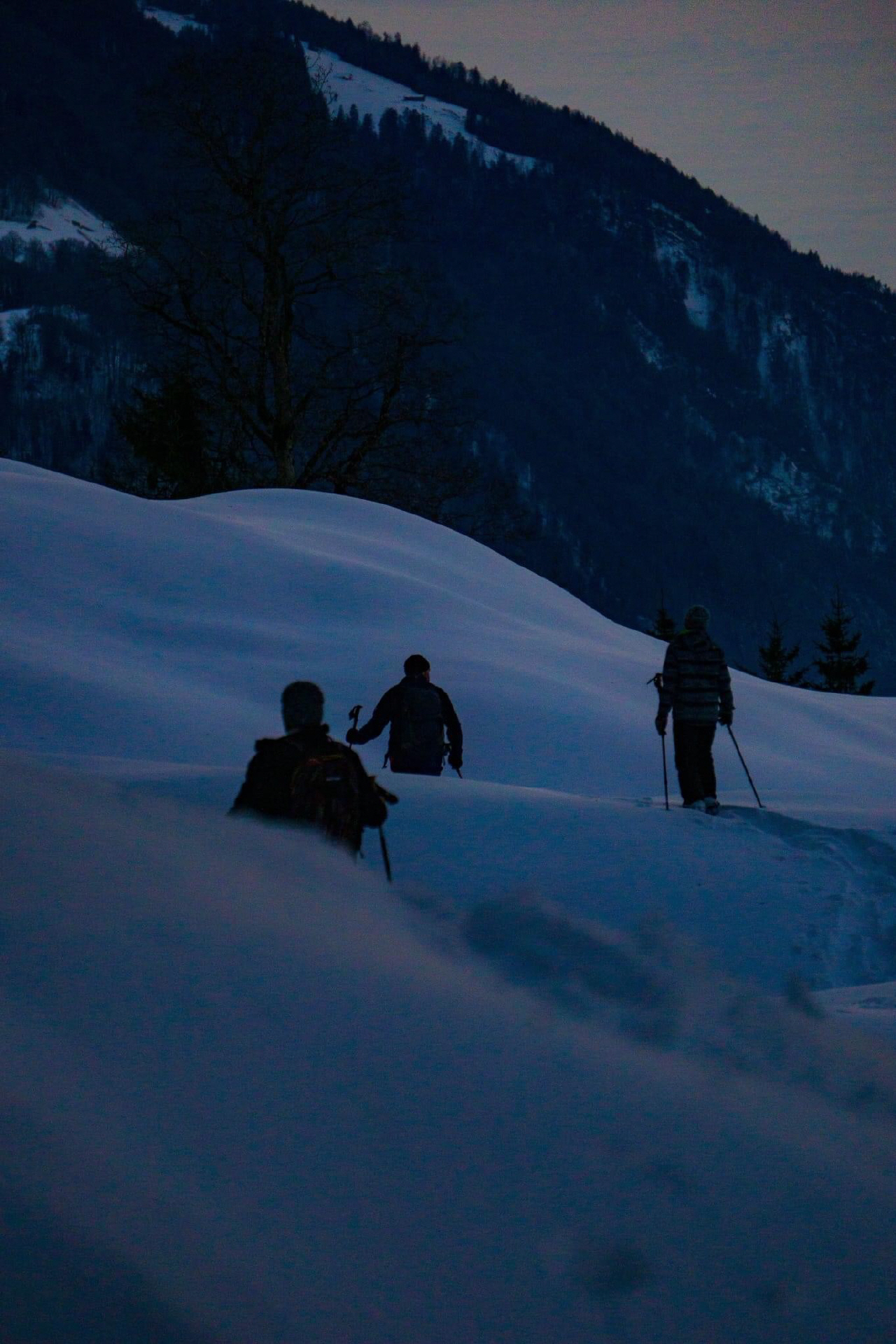 Beim Treffpunkt an der Talstation der Seilbahn Brunni-Holzegg rüsten wir Euch mit Schneeschuhen und Stöcken sowie Stirnlampen aus. Gemütlich geht’s dann auf dem Schneeschuhtrail zum Bergrestaurant Holzegg, wo der Wirt Euch mit seinem Team mit feinstem Alpenfondue verwöhnt.